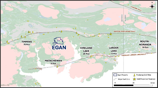Le projet Egan est un projet d’exploration aurifère détenu à 100 % par Harfang, qui couvre 449 claims totalisant environ 12 000 hectares au cœur de la ceinture de roches vertes de l’Abitibi, en Ontario. Il est stratégiquement situé entre les camps aurifères de Timmins, Kirkland Lake et Matachewan, à environ 50 km à l’est-sud-est de Timmins et à 50 km au nord de Matachewan. Le projet est facilement accessible par des routes asphaltées et des chemins de gravier, ainsi que par des chemins forestiers récemment construits. Certains claims sont assujettis à une redevance NSR de 2,0 %.