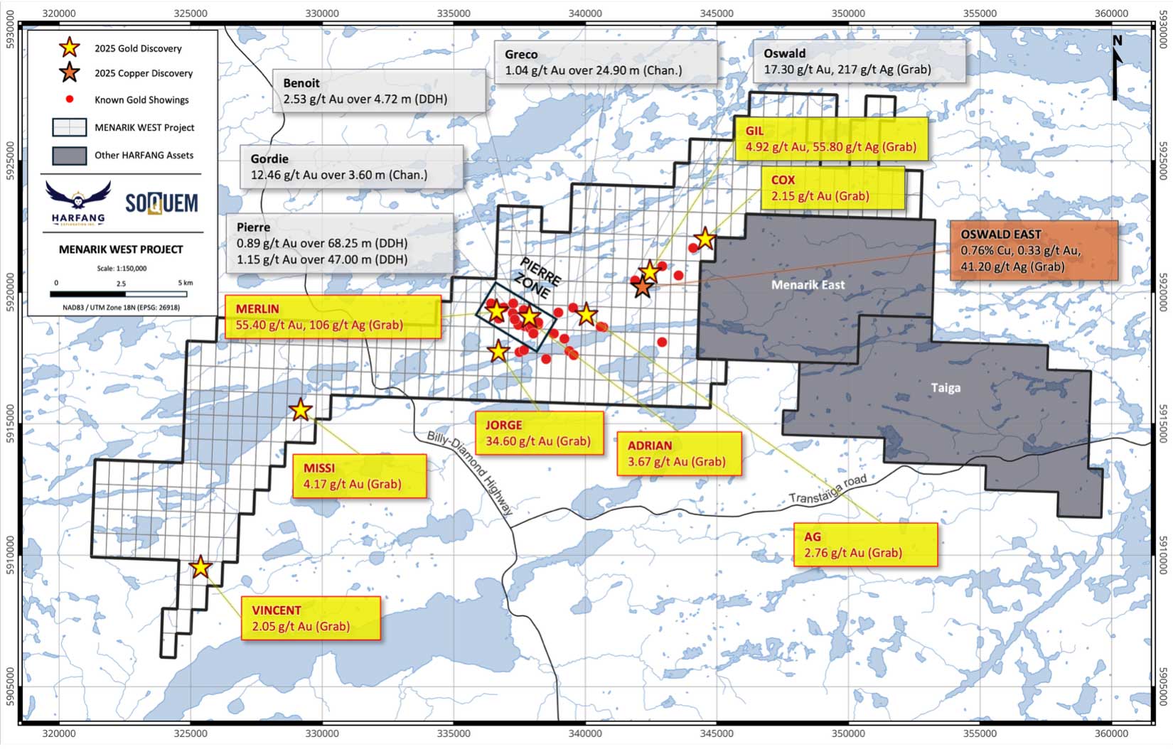 Montreal, October 29, 2025 – Harfang Exploration Inc. (TSX-V: HAR) (“Harfang”) and SOQUEM Inc. (“SOQUEM” and together the “Companies”) announce multiple high-grade gold discoveries from their joint summer 2025 exploration program at Harfang’s wholly-owned Menarik West Property (the “Property”), located in Eeyou Istchee James Bay, Québec (see Figure 1).
