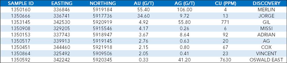 The Merlin and Jorge discoveries, both located in the central area of the Property, represent the vein-type gold discoveries with the highest grades from the summer exploration program.