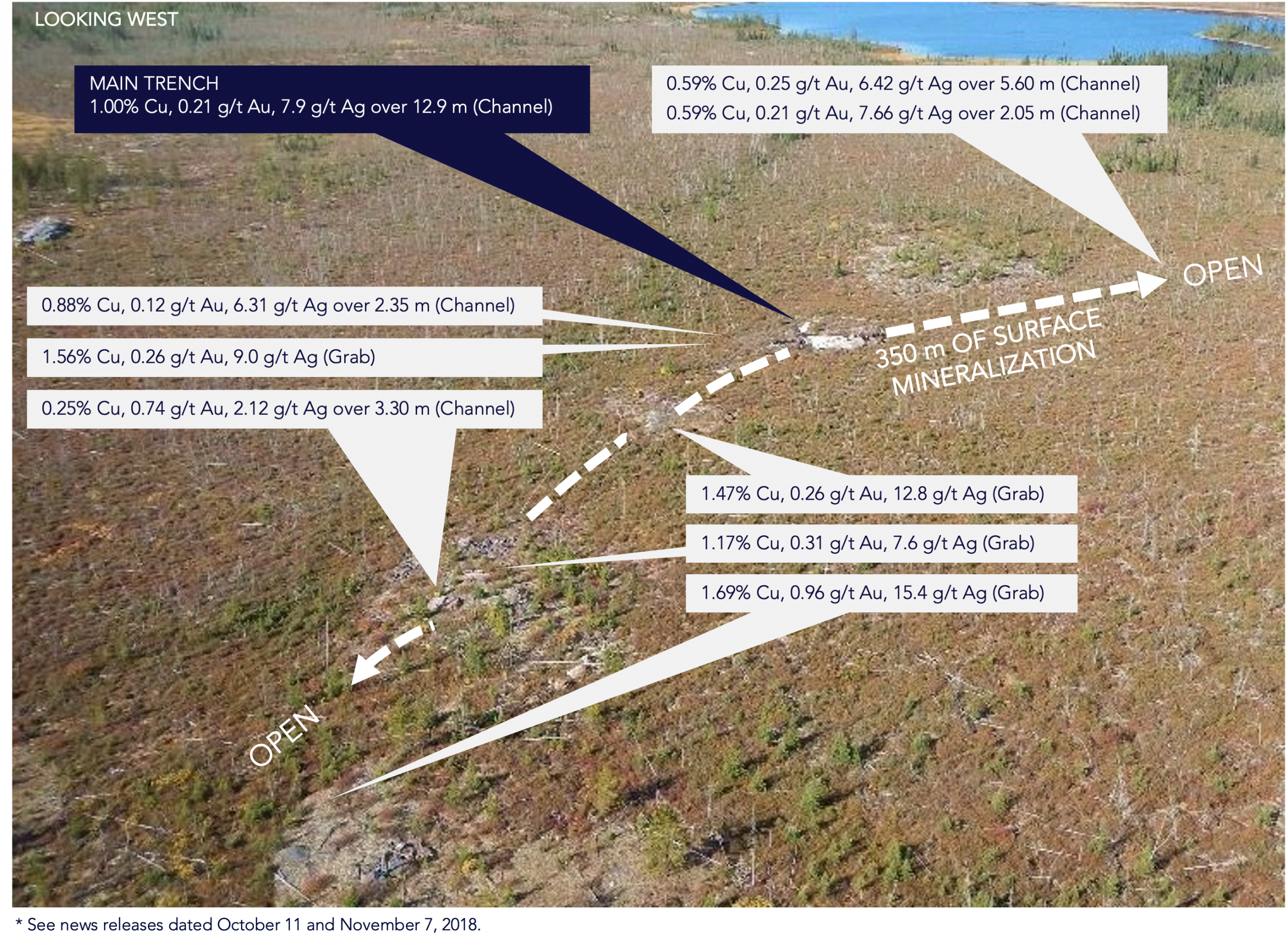 - POLYMETALLIC Cu-Au-Ag MINERALIZATION: Surface mineralization in outcrops over a 350-metre strike length while the results from the DC-IP survey indicate an intense chargeability anomaly suggesting potential mineralization spanning more than 650 metres.